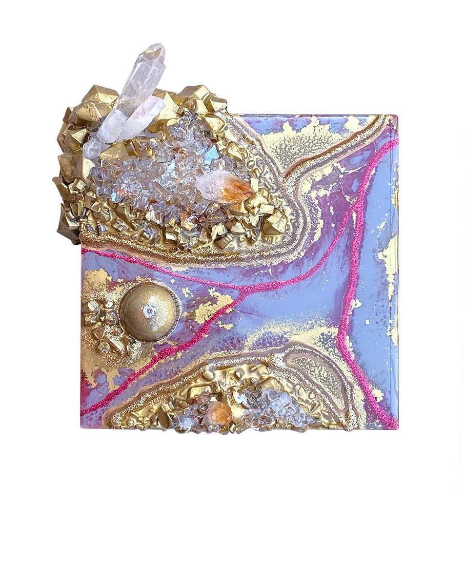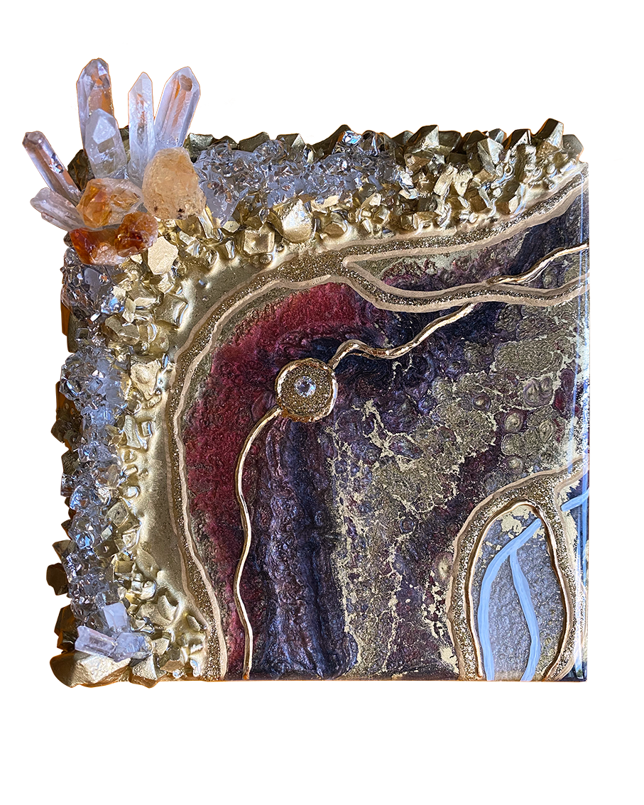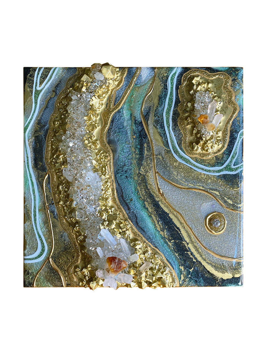 Geode Thirteen -Citrine & Clear Quartz Energy: Available 6inx6in. Resin on Wood Panel. Natural quartz points, natural citrine and 6mm CZ Cold Gold pigment