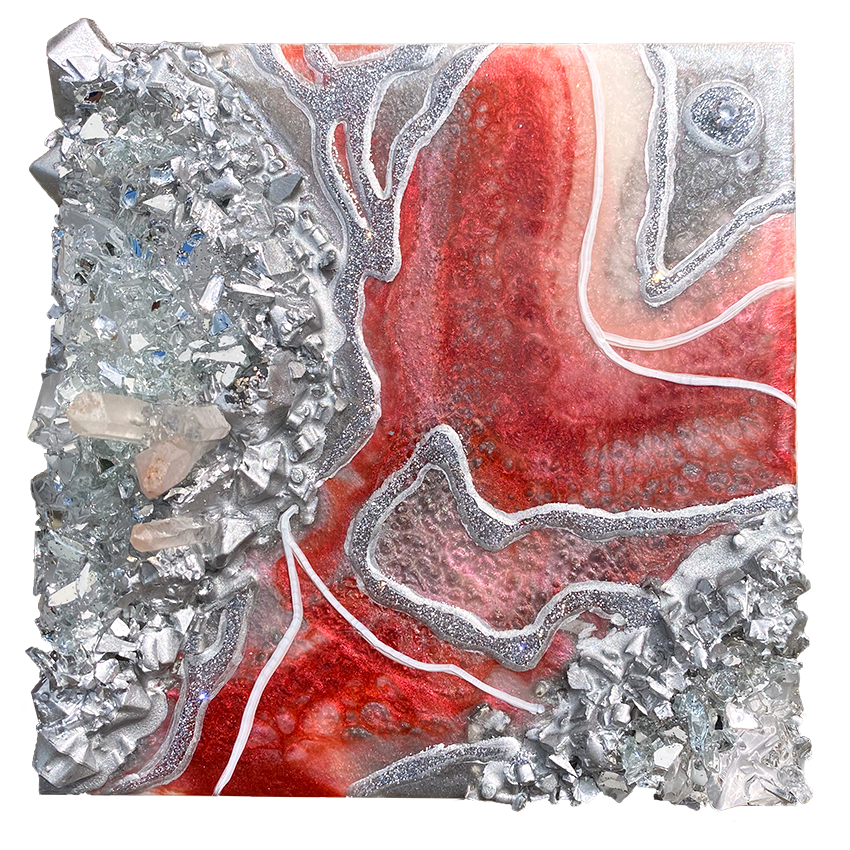 Geode Eight - Rose Quartz Energy: Sold 6x6in Wood Panel - Resin Natural quartz points, Silver leaf lines, natural quartz points and 6mm CZ