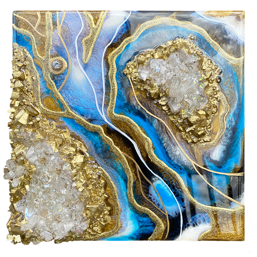 Geode Twelve -Citrine & Clear Quartz Energy: Available 6inx6in. Resin on Wood Panel. Natural quartz points, natural citrine and 6mm CZ Cold Gold pigment